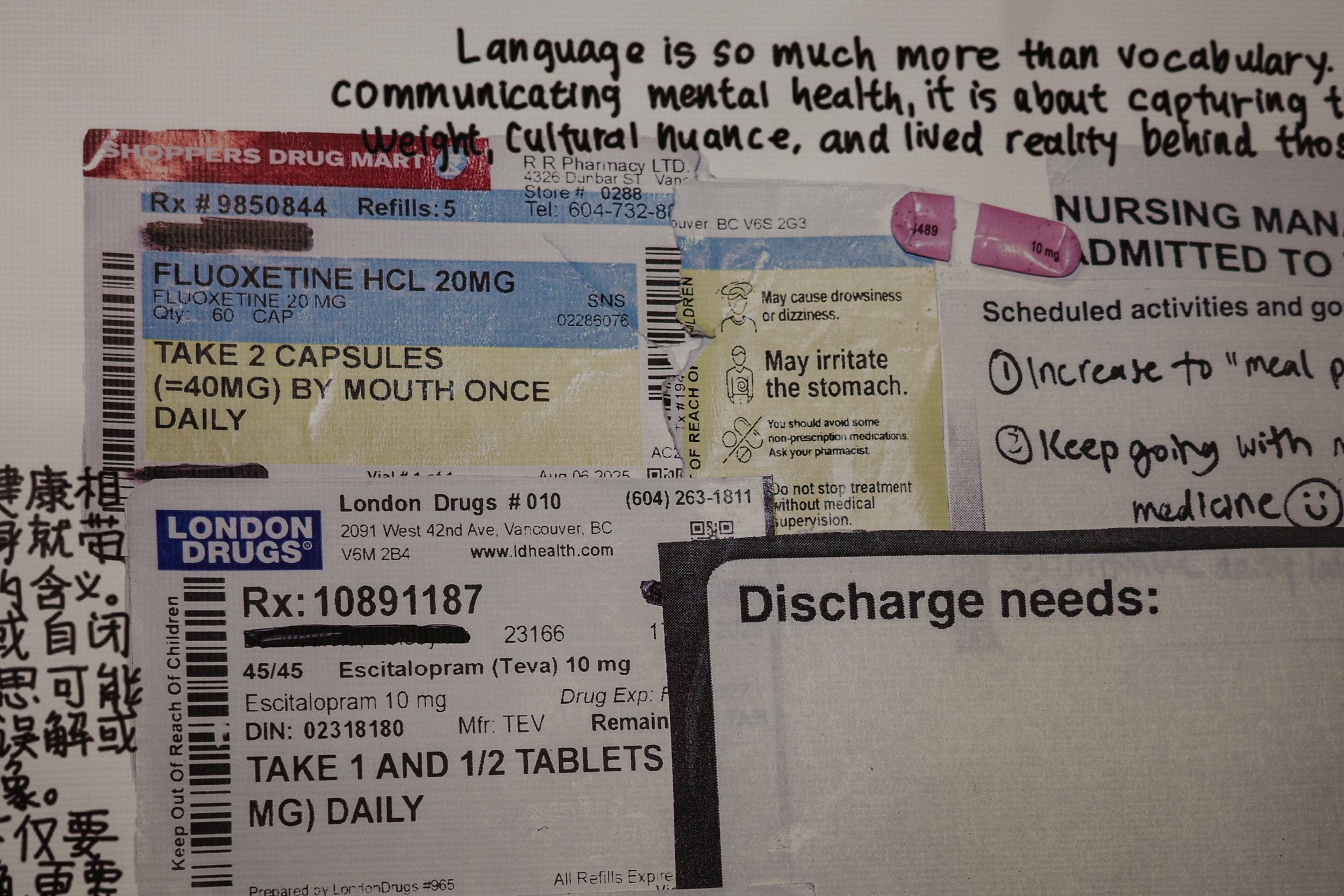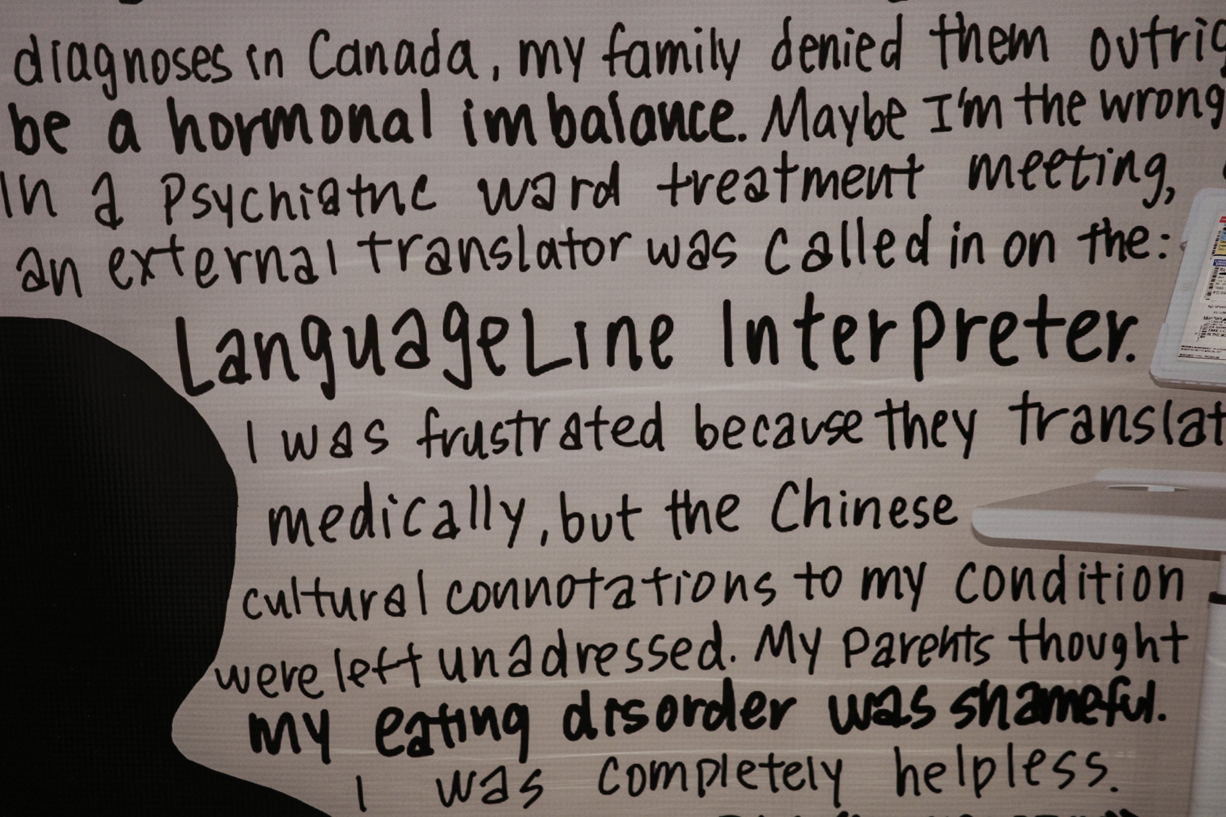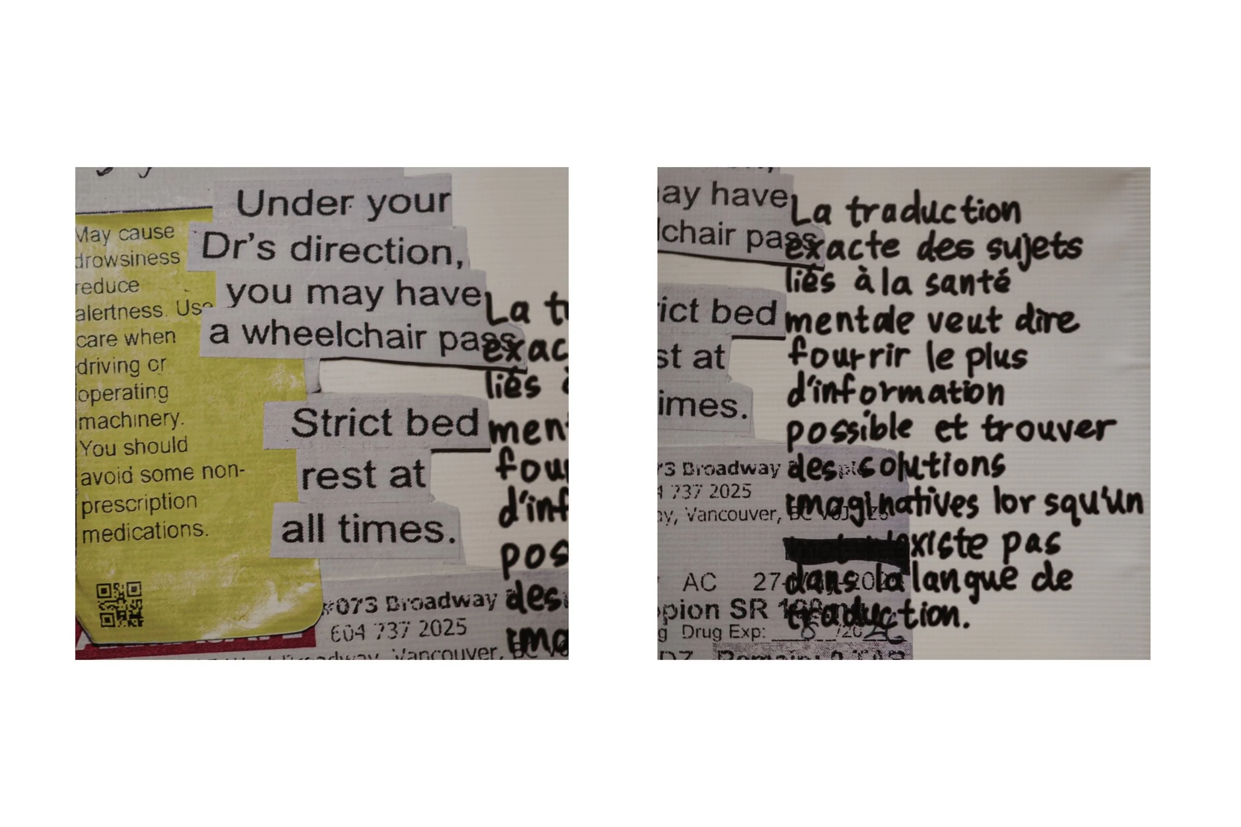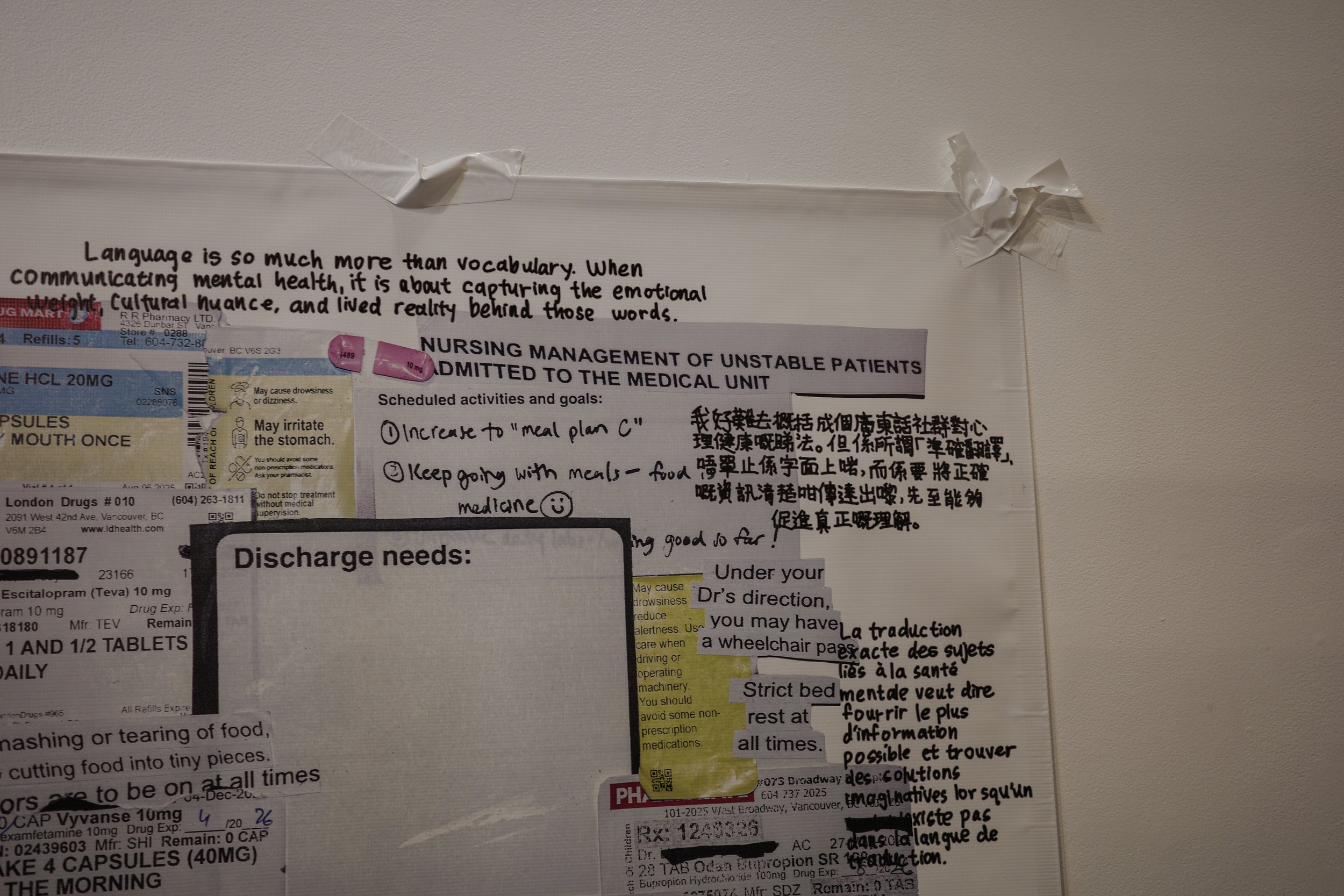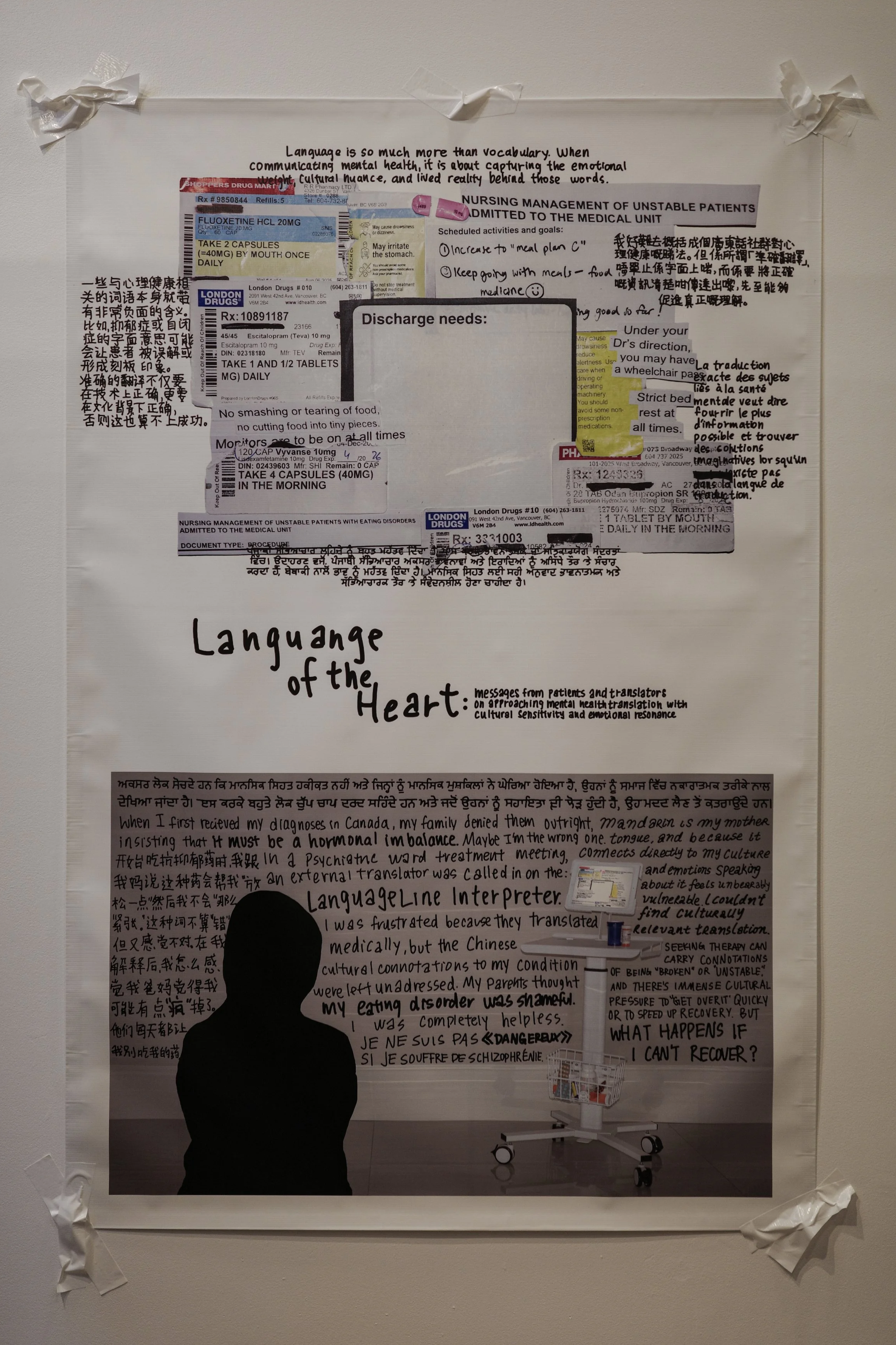 The piece unfolds in three parts: a replica of the LanguageLine Interpreter, standing in for the gap between translation and understanding; a collage of hospital documents, treatment plans, and medication records, echoing the sterile directions patients are asked to navigate; and messages from patients and translators across cultures, insisting on what is lost when meaning is reduced to jargon alone.