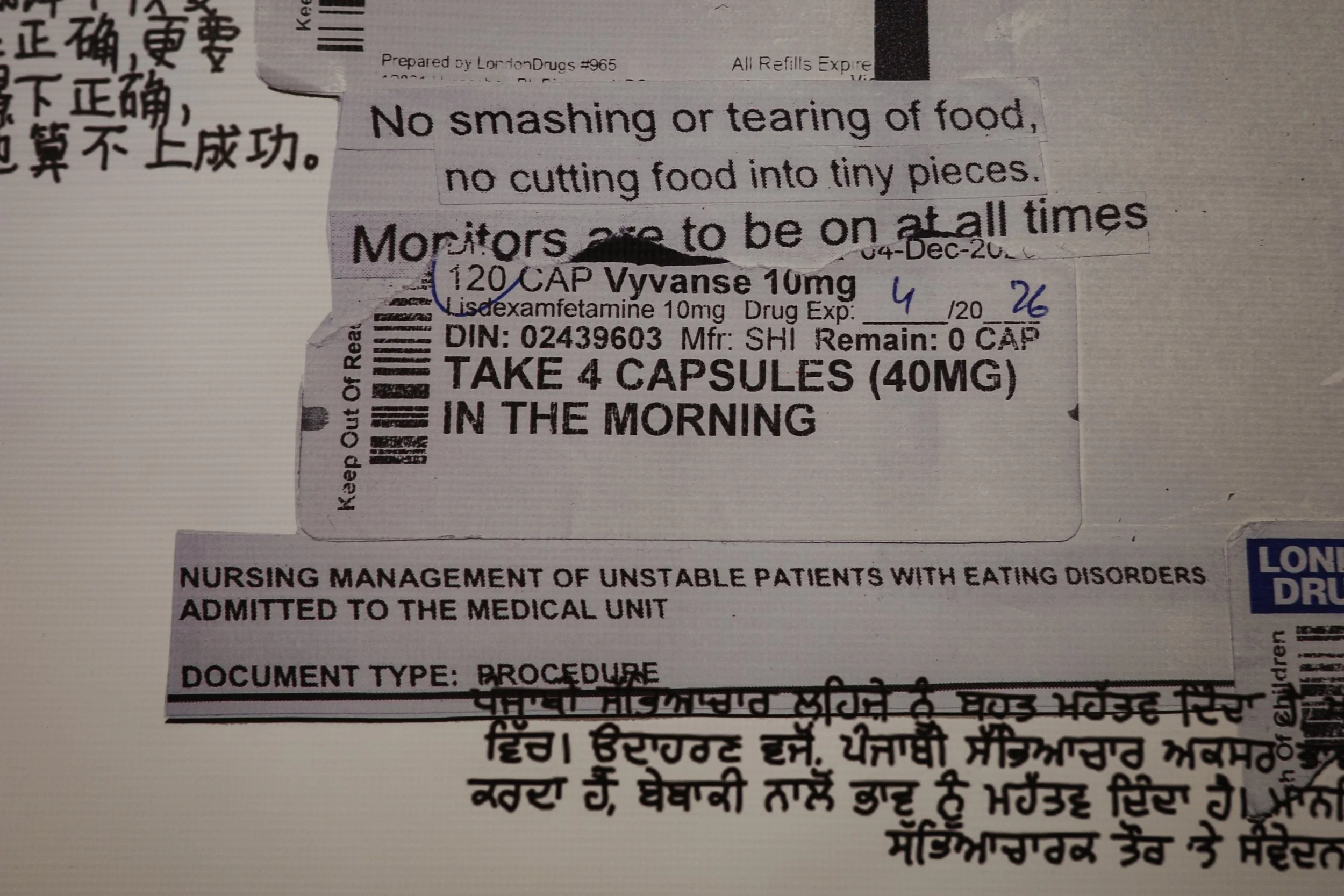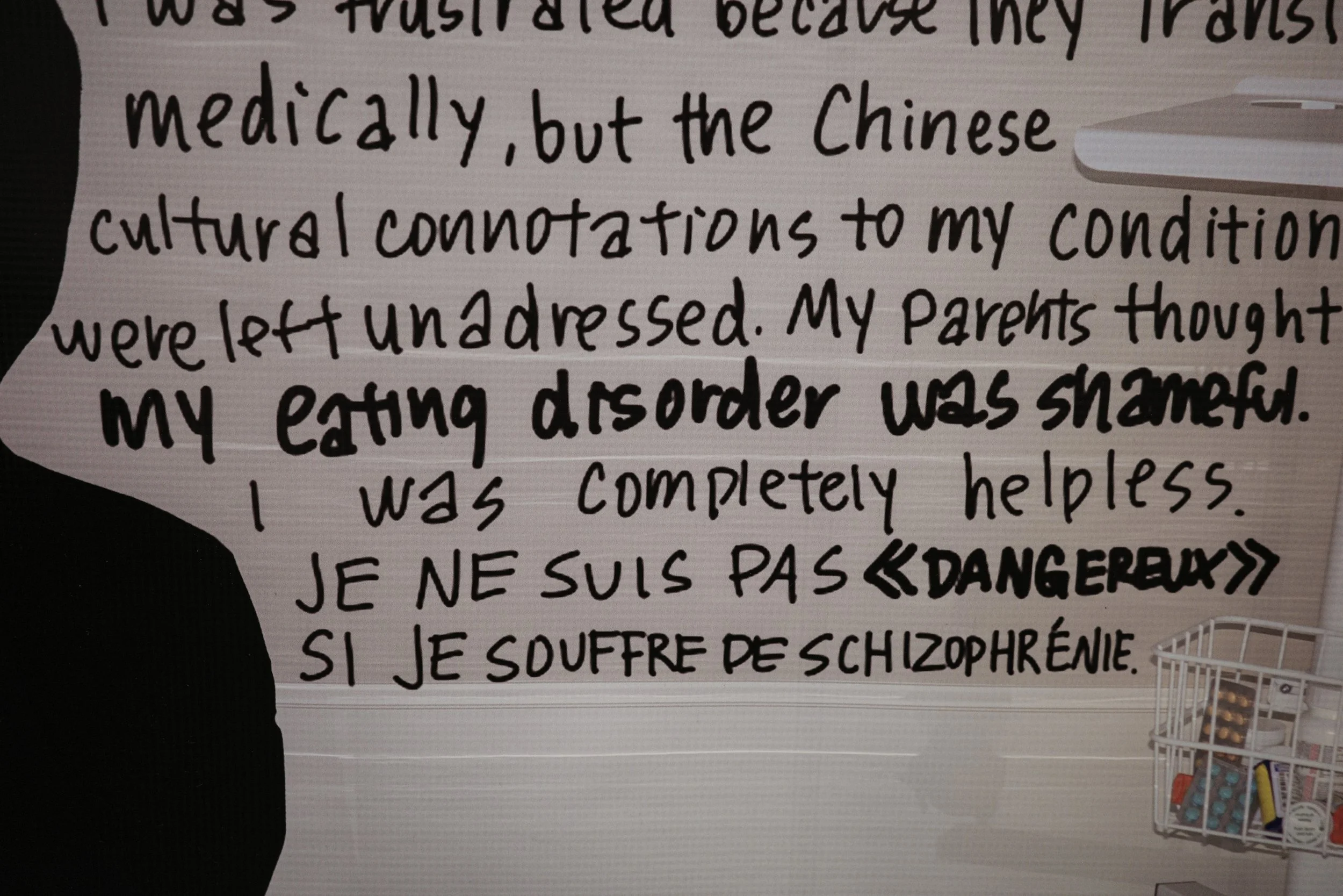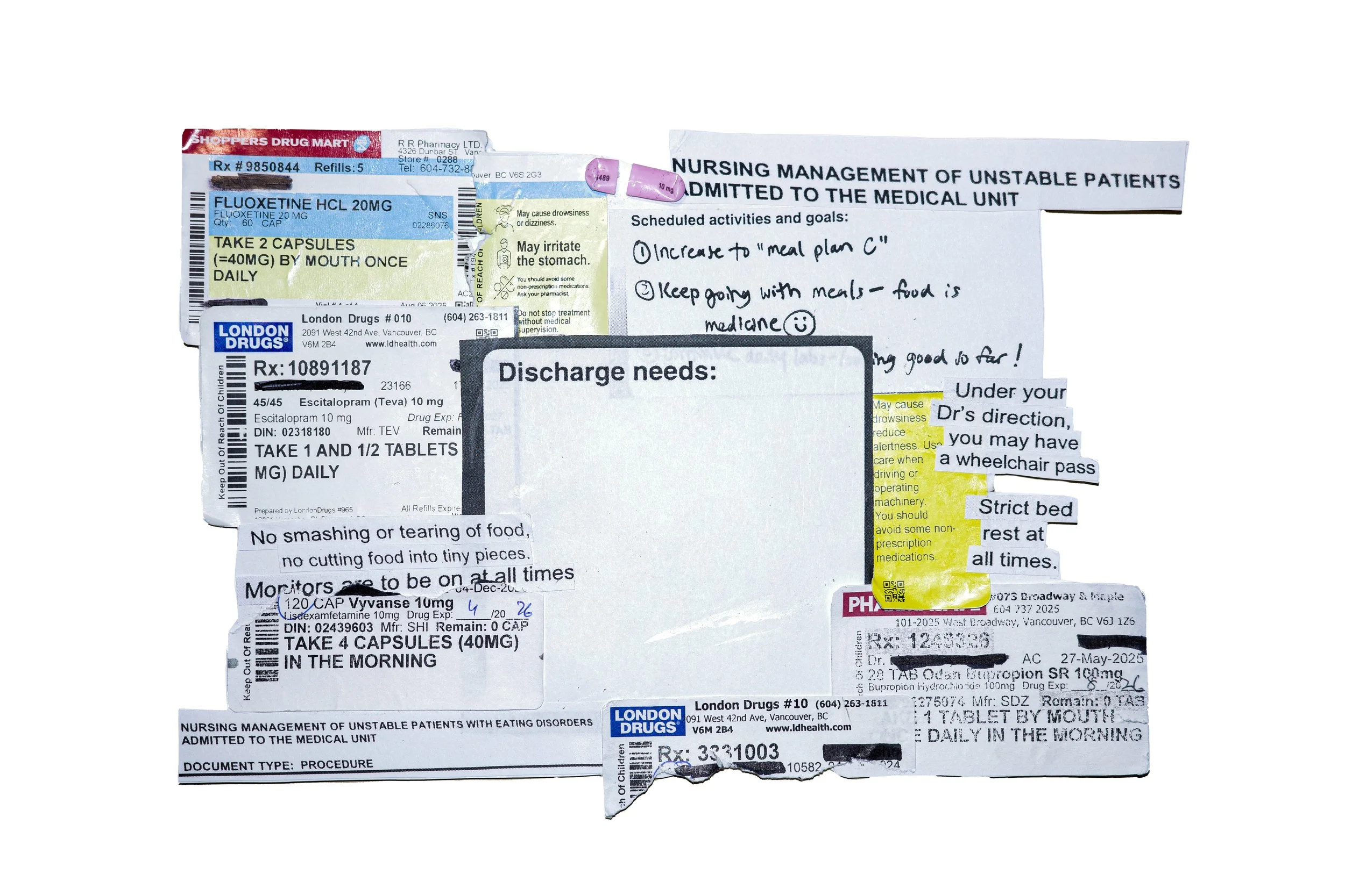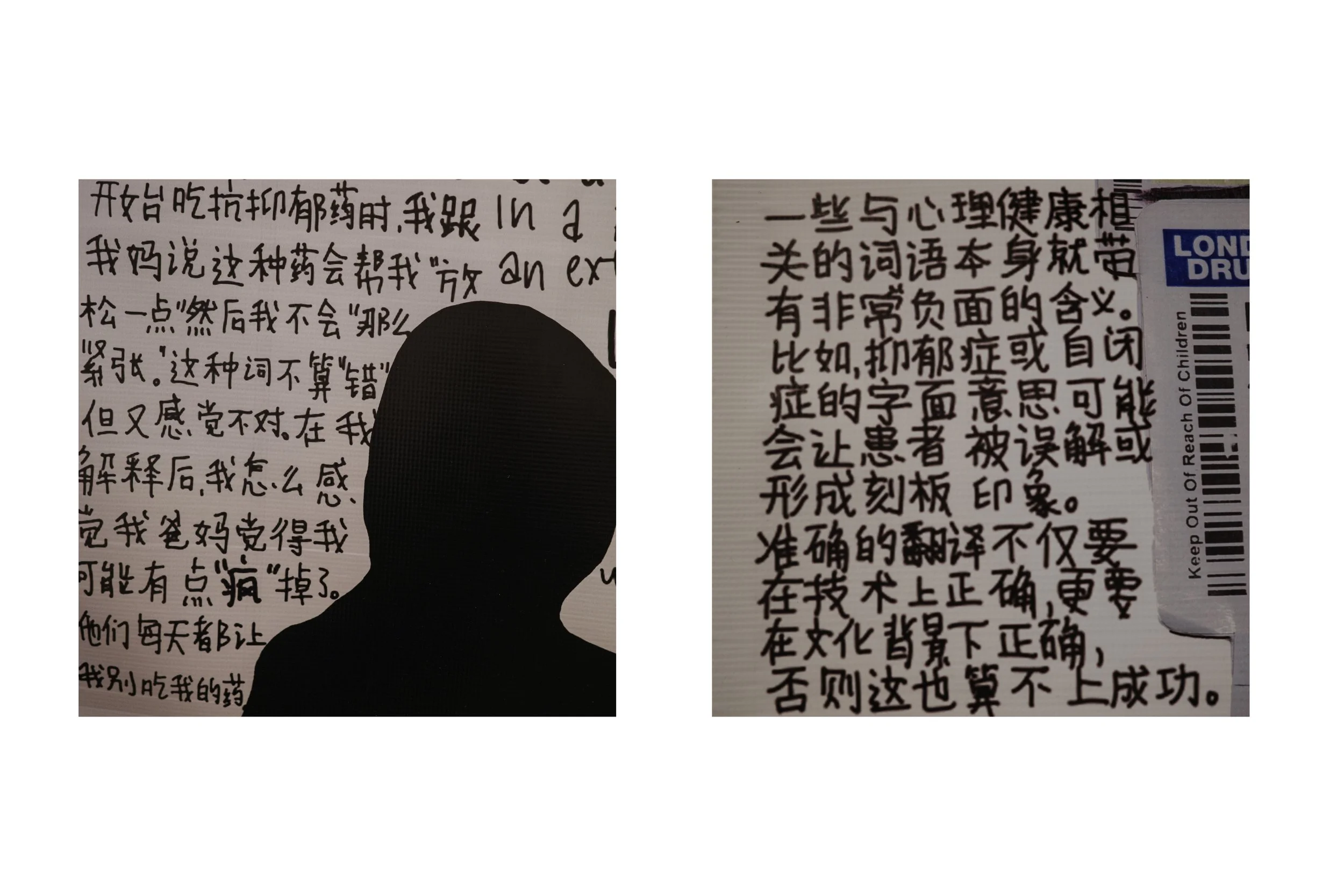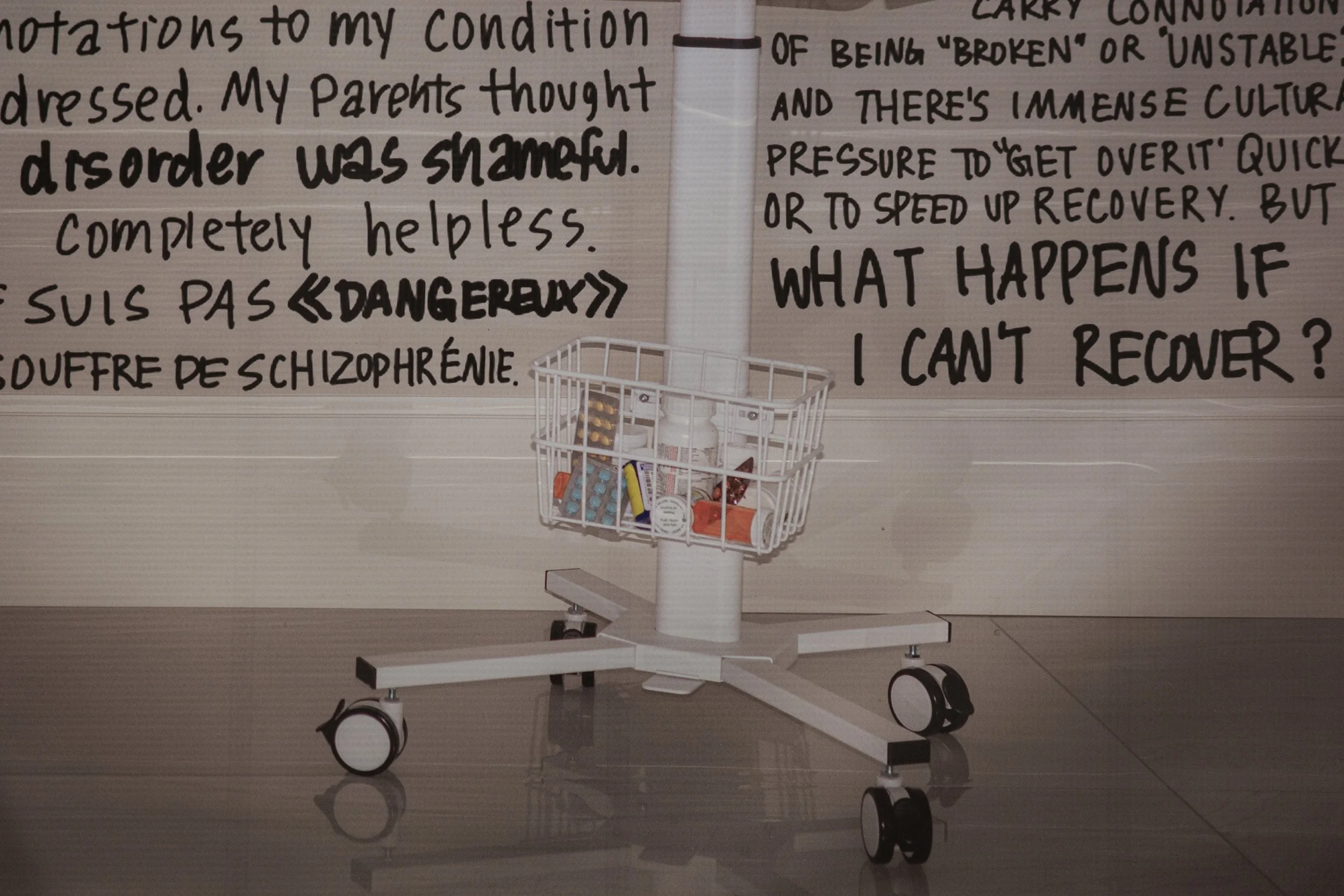 The piece unfolds in three parts: a replica of the LanguageLine Interpreter, standing in for the gap between translation and understanding; a collage of hospital documents, treatment plans, and medication records, echoing the sterile directions patients are asked to navigate; and messages from patients and translators across cultures, insisting on what is lost when meaning is reduced to jargon alone.